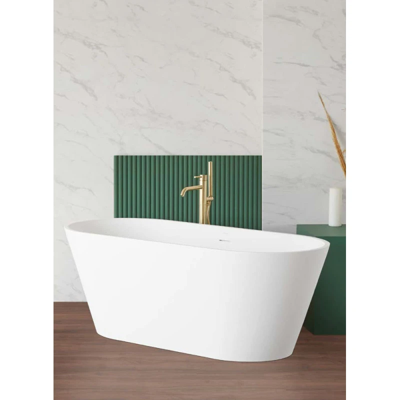– Baignoire îlot Modern, en matériaux composite Solid Sanycess. Sa surface non poreuse lui procure un toucher soyeux et chaud qui facilite en plus son entretien et lui permet de résister aux produits de nettoyage habituels de salle de bain