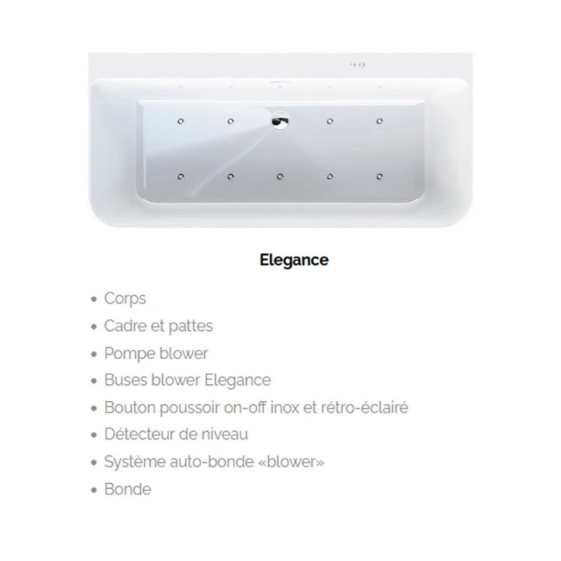 – Pour les baignoires type Elegance, la puissance est de 500 W avec 9 jets Airpool et 6 Cromo LED