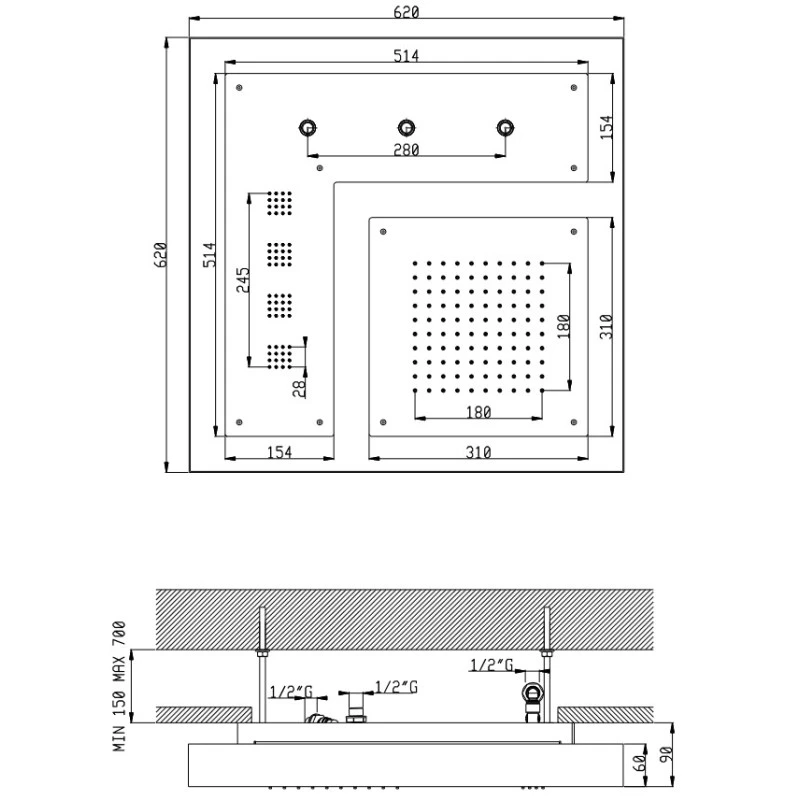 – Ciel de douche chromothérapie encastré à faux-plafond 620 x 620 mm