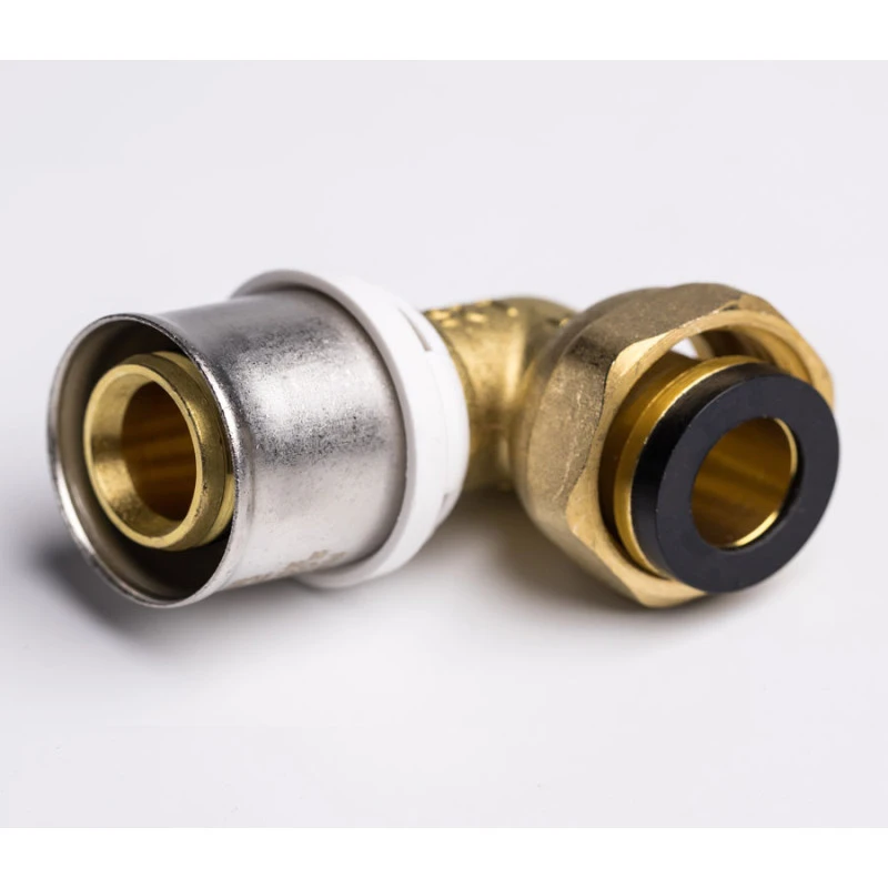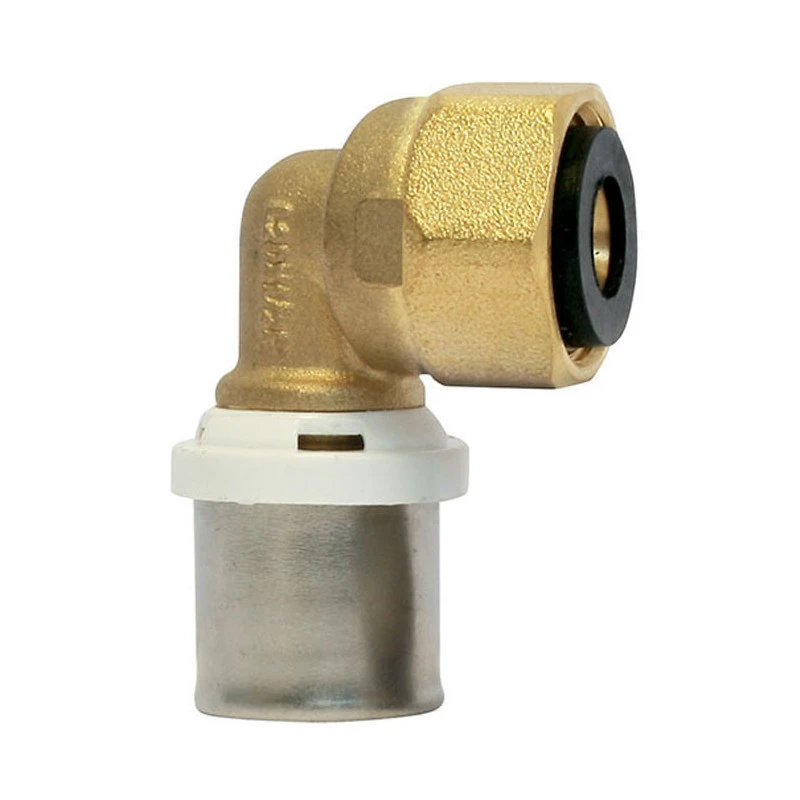 Raccord coudé femelle écrou libre à sertir pour tubes multicouches.