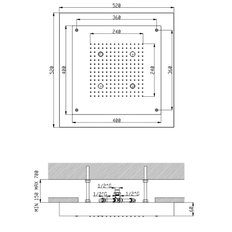 - Ciel de douche encastré à faux-plafond 520×520 mm – 3 fonctions