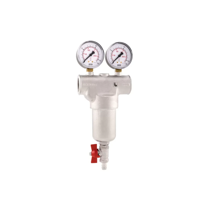 Adapté pour l’utilisation dans les installations hydrauliques, de chauffage et de climatisation, air comprimé Équipe de cartouche filtrante extractible, double manomètre et robinet portetuyau pour l’évacuation des impuretés.