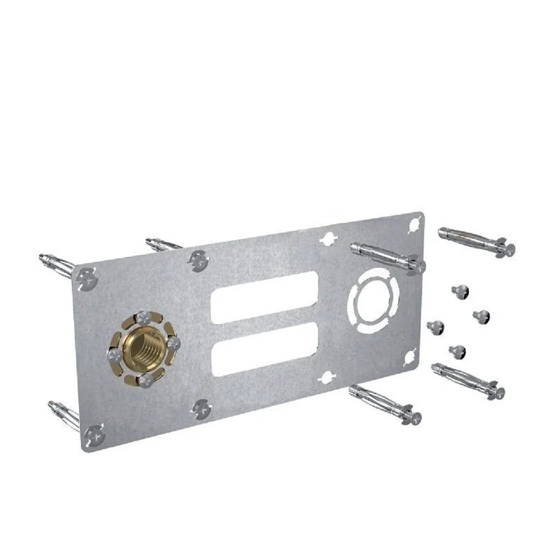 Fixation robinetterie pour cloison en plaque de plâtre. – cuiivre à souder 14 • Permet de raccorder une robinetterie encastrée par l’extérieur de la cloison et sans reprise de plâtre • Percer 2 trous de Ø 63 mm dans la cloison avec une scie cloche • Entraxe 150 mm