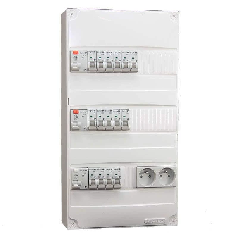 Tableau électrique pré équipé T4-T5 sans chauffage avec coffret 3 rangées (porte en option) de 15 disjoncteurs (automatiques) et 3 interrupteurs différentiels, d’une prise de courant double (offerte). l’ensemble est monté-câblé en amont, plans fournis, Il répond à la norme NF et aux exigences des organismes de contrôle.