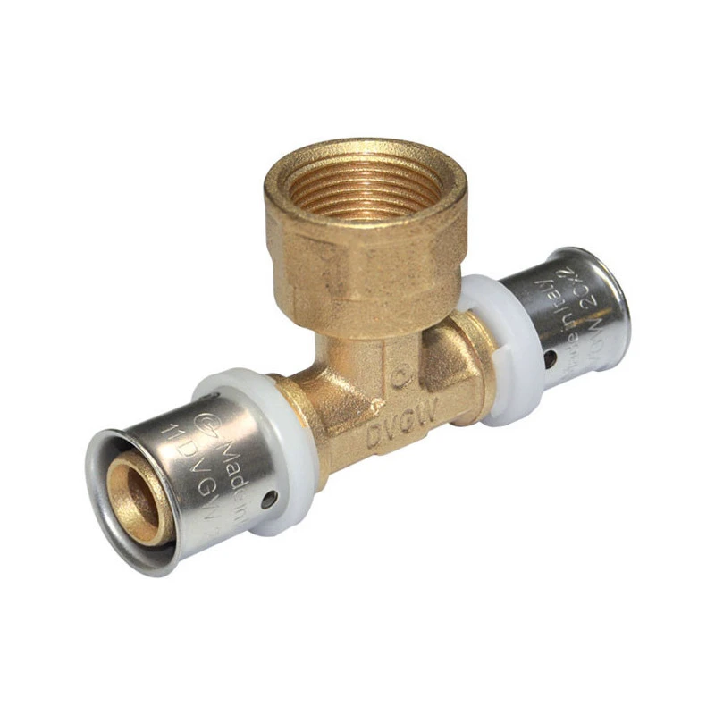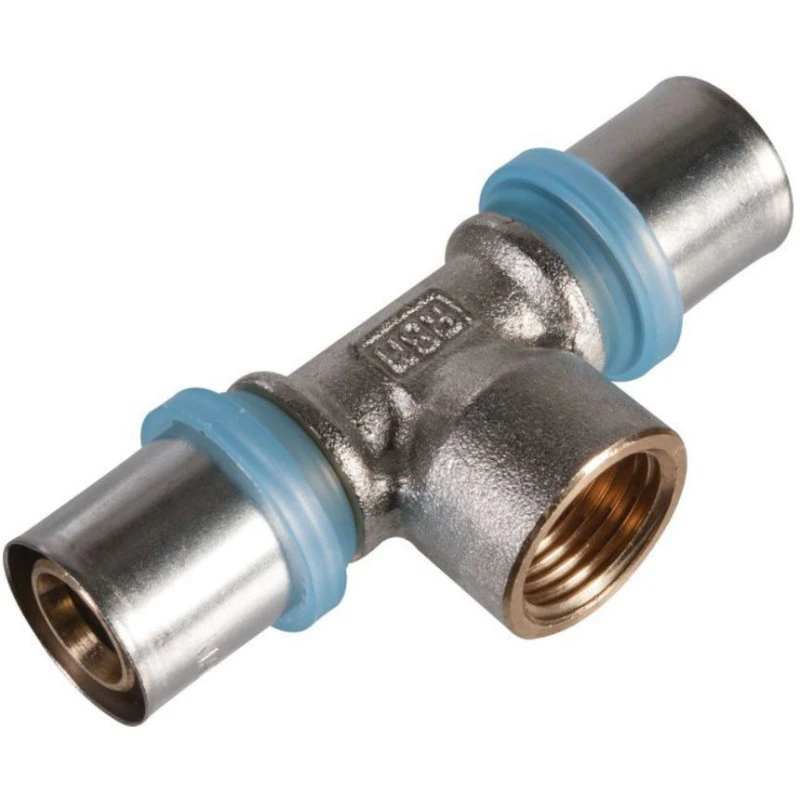 Raccord té femelle à sertir pour tubes multicouches.