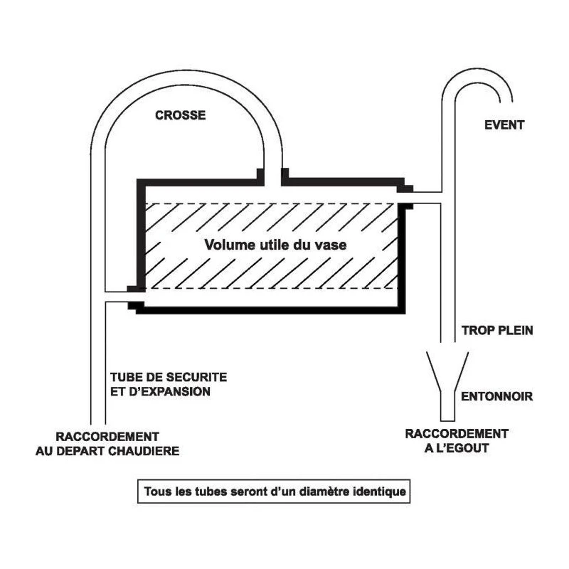 Le raccordement doit se faire directement au départ chaudière, sans organe de réglage ou de fermeture entre la chaudière et le vase, au point le plus haut de l’installation. La pose de soupapes de sécurité est obligatoire.
